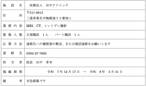 求人案内 【求人案内】桑名 田中クリニック 2025年12月17日 mieart_test 桑名 田中クリニックから正規職員1名 パート職員1名の募集 田中クリニックのHPはこちら 連絡先:0594-27-7800