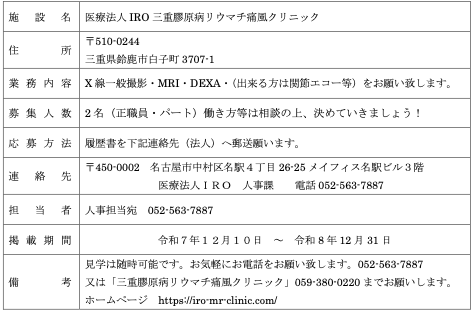 三重膠原病リウマチ痛風クリニックから2名の募集