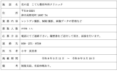 求人案内 【求人案内】こてら整形外科クリニック 2026年3月10日 mieart_test こてら整形外科クリニックから非常勤職員1名の募集 こてら整形外科クリニックのHPはこちら 連絡先は059-271-8739